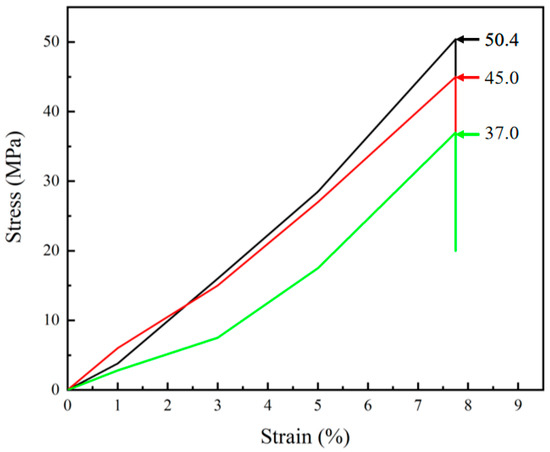 The cohesive strength of the coating itself is generally higher than the bonding strength between the coating and the substrate, and thus the damage and peeling of the coating mostly occurs at the junction [35]. Figure 6 shows the stress–strain curve obtained from the tensile test. It can be seen that the bonding strengths of the coatings are 50.4 MPa, 45.0 MPa, and 37.0 MPa, respectively, and the average bonding strength is 44.1 MPa.
