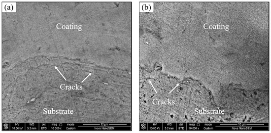 The macroscopic fracture morphology shown in Figure 7 indicated that the fracture position was located at the junction and the substrate. In order to further confirm the fracture position, the cross-section of the coating was corroded with Keller reagent, and then observed by SEM at a high-magnification. Figure 8 shows the morphologies of the coating before and after the etch. It can be observed that the Al-25Si coating was closely bonded with the substrate; meanwhile, cracks can be seen inside the substrate, which are due to the large residual stress on the subsurface of the substrate induced by high-speed alumina particles during the sandblasting pretreatment. Additionally, the accumulation and release of heat during the spraying also produced a large thermal stress.