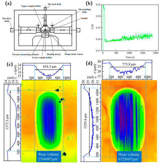Generally speaking, the ideal working temperature of lubricating oil is 73.9–93.3 °C. However, in actual working conditions, due to high temperature gas and friction flash temperature, the temperature here is often far beyond the ideal working range, and the viscosity of lubricating oil decreases and becomes thinner. Even exceeding the flash temperature of the oil, coke and other phenomena appear, and the lubricating effect is significantly reduced. In this experiment, on the one hand, since the working temperature of the engine is usually 100–150 °C, the temperature of the platform in the experiment is set to 120 °C; before friction and wear, three drops of lubricating oil (about 0.2 mL) were dropped on the contact surfaces of the upper and lower samples, and no more drops were dropped during the whole test process.