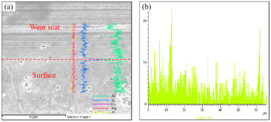 It is worth noting that the oxygen element was detected in Points 1–3, suggesting the possible existence of oxidative wear. Thus, elemental line scan analysis was performed on the worn and unworn surfaces of the inner hole Al-25Si coating under oil bath. As can be seen from the distribution curve of oxygen element shown in Figure 12, due to the existence of furrows, the worn area of the surface increased, which resulting in slightly higher oxygen content. However, the unworn and worn surfaces displayed similar oxygen contents, suggesting no serious oxidative occurred on the worn surface. This might be because the lubricating oil could isolate the air and thus greatly weaken the oxidative wear.