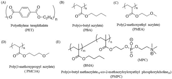 Chemical structure of (A) polyethylene terephthalate (PET); (B) poly(n-butyl acrylate) (PBA); (C) poly(2-methoxyethyl acrylate) (PMEA); (D) poly(3-methoxypropyl acrylate) (PMC3A), and (E) poly(n-butyl methacrylate70-co-2-methacryloyloxyethyl phosphorylcholine30) (PMPC).