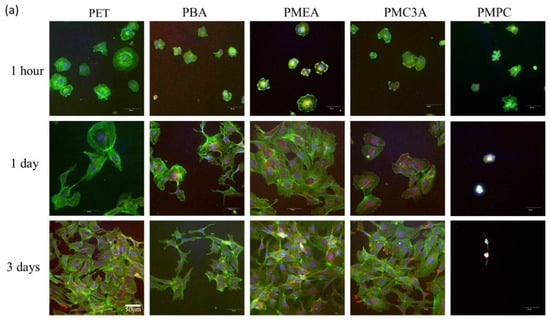 Figure 1 shows the chemical structures of the polymers investigated. Previously, it was clearly demonstrated that PMEA-analogous polymers (PMEA, PMC3A, and PBA) contained three different types of water: FW, IW, and NFW [41,42,43,44]. Based on this analysis, the physicochemical properties, including molecular weight (Mn), glass transition temperature (Tg), amounts of FW, IW, NFW, and equilibrium water content (EWC), are summarized in (Table 1). The amounts of each water content (FW, IW, NFW, and EWC) and Tg changed in the following order: PBA < PMC3A < PMEA and PMEA > PMC3A > PBA, respectively. It was also reported that the hydrophilicity of the side chain of a polymer was linked to hydrated water and cell attachment behavior [45]. In contrast, the surface morphologies of PMEA-analogue-coated PET substrates were investigated using transmission electron microscope (TEM) and AFM previously. TEM observations indicated that the thickness of the spin-coated film was approximately 70–80 nm [46], and AFM topographic analysis identified the microphase-separated structure as polymer- and water-rich domains of specific coated substrates [47] in which the water-rich domain worked to reduce the adsorption of fibrinogen on PMEA. In addition, because of the strong effect of the physicochemical properties of the biopolymer interface, the surface type was confirmed by CA measurements in dry and hydrated states. The CA of each coated substrate was measured using both sessile drop and captive air bubble methods (Table 2). The results were recorded for 60 s and presented herein at exactly 30 s. In the sessile drop measurements, the CA decreased in the following sequence: PMPC > PBA > PET > PMC3A > PMEA, whereas results from captive air bubbles exhibited different trends as PMPC > PMEA > PMC3A > PBA > PET at 30 s and 24 h of soaking. These results revealed that proper coating of each polymer on the PET substrate and hydration caused a structural change in the coated surface for specific coated substrates. No significant changes were observed for the PET substrates.