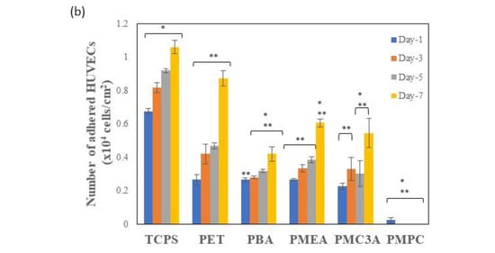Cell attachment and proliferation assays were performed using a 24-well plate (IWAKI, Tokyo, Japan). Initially, the 24-well plate was coated with PMPC (0.5 w/v%) and stored for drying. The precoated polymer substrates were thereafter fixed in the 24-well plate using glue on the back side of each substrate. The substrates were then cured under ultraviolet (UV) light for 30 min. Phosphate-buffered saline (PBS) was then added to the well and stored in the incubator for 1 h at 37 °C. Afterwards, PBS was removed, and culture media were added and incubated under the same conditions for another 1 h at 37 °C. HUVECs were seeded on the substrates at 1 × 104 cells/cm2 in serum-containing media and allowed to adhere and proliferate on the surface of the substrates for 1 d, 3 d, 5 d, and 7 d. The culture media were changed every two days for 3 d, 5 d, and 7 d. After cell cultivation, at specific time intervals, the cells were counted using a microplate analyzer from the standard curve prepared by the colorimetric WST-8 assay (Dojindo Laboratories, Kumamoto, Japan).