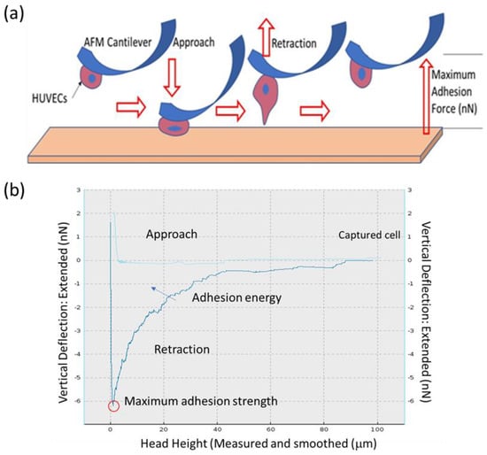 The PMEA-analogous substrates were exposed under UV for 30 min and thereafter incubated with PBS for 1 h at 37 °C. Subsequently, an EGM-2 medium was added to the substrate and freshly detached cells (passage: 5–6) were injected. In contrast, the tipless cantilever TL-CONT (spring constant k = 0.2 N/m, NANOSENSORS) was coated by fibronectin with human fibronectin solution (1 mg/mL) for 20 min at room temperature. A single HUVEC was captured with a tipless cantilever for 10 min of holding time (set point: 2 nN) (Figure S1 in Supplementary Materials). The Z-length for a cell was 100 µm of the vertical displacement range of the AFM. We have found that the HUVEC cells are around 20 µm in size. A cell detached at about 70–90 µm. The force curves between the cell and the substrate were recorded using an atomic force microscope AFM (CellHesion, Bruker, Billerica, MA, USA) equipped with a cell-attached tipless cantilever (set point: 2 nN, approach rate: 5.0 μm/s, holding time: 120 s, retraction time: 15 μm/s) (Figure S3). A single cell was used to measure 1–3 interactions to avoid the effect of damage of cell on measurement. The measurements were conducted at more than 10 different points. The set point for measuring the cell adhesion strength was determined from the relationship between the set points and the cell adhesion strength of HUVECs attached to the PMEA-coated PET substrate [39]. In brief, we selected contact time 120 s and set point 2 nN after investigating different contact times (60, 120, 240, and 300 s) at different set points (0.5, 1, 2, 3, and 5 nN). Linear relationships between contact time and adhesion force and set point and adhesion force were found. As we know, HUVECs are very slow with doubling time (24–36 h). So, we fixed contact time 120 s because initial contact would not happen earlier due to slow doubling time. In contrast, we realized that at fixed set point 2 nN and 120 s contact time, HUVECs showed considerable adhesion force. The adhesion force was defined as the maximum force for the detachment of the cell from the substrate, corresponding to the force at the minimum point of the retraction curve. Adhesion work was estimated as the amount of work required to detach the cell from the substrate, corresponding to the area enclosed by the baseline and retraction curve [40].