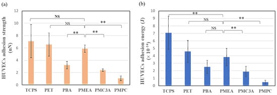 (a) HUVECs adhesion strength and (b) adhesion energy on various polymer substrates. The data represent the mean ± SD (n > 10), ** p < 0.05 compared with PMEA and NS = Not Significant.