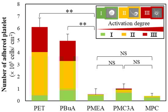 Summary of the human platelet adhesion experiments. Numbers of the adhered platelets on the coatings of the PMEA, PMC3A, PBA, PMPC, and bare PET. The data represent the means ± SD, n = 15, **: p < 0.01 (vs. PET) and NS = Not Significant.