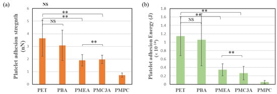 Comparison of (a) platelet adhesion strength and (b) adhesion energy on different polymer substrates. The data represent the mean ± SD (n > 5), ** p < 0.05 (vs. PET and NS = Not Significant).