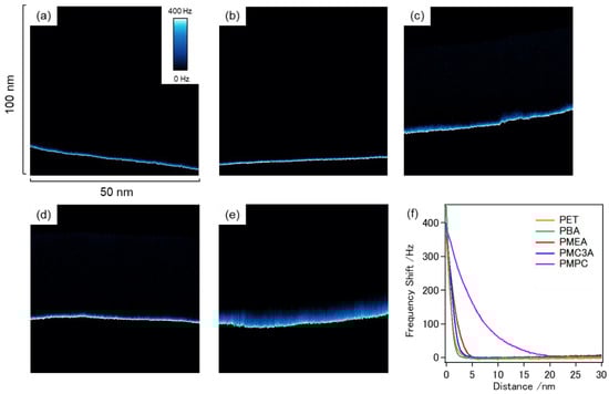 Images of FM-AFM z–x scan on (a) PET, (b) PBA, (c) PMEA, (d) PMC3A, and (e) PMPC. (f) Frequency shift–distance curves obtained from the averaged cross section of (a–e).