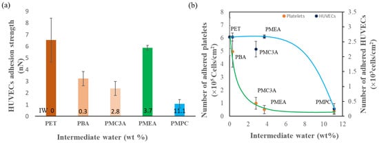 Effect of IW content on (a) HUVECs adhesion strength and (b) number of adhered platelets and HUVECs on PMEA-analogous polymers.