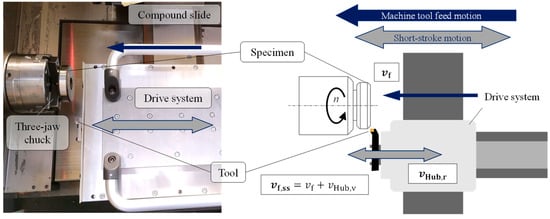 The concept of the SST process is characterized by a combination of movements alternating in the positive and negative direction of the machine tool feed motion. The application of an additional air-bearing drive unit mounted on the machine tool feed axis has proved to be advantageous in realizing these alternating movements. The integration of the short-stroke drive system into a lathe and its superimposed motions are shown in Figure 1.