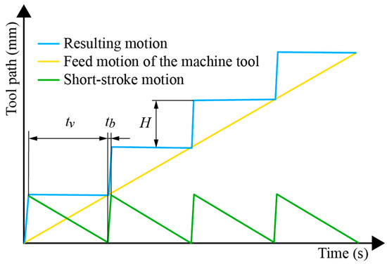 where is the number of revolutions of the machined workpiece per time unit and the machine feed in the direction of the Z-axis. After a defined time in the stop phase, the tool motion changes its direction and moves into the positive direction of the feed motion. This phase is referred to as the start phase. The resulting motion of the tool is depicted schematically in Figure 2 as the superposition of the feed motion of the machine tool and the short-stroke motion of the drive system.