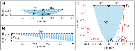 A standard tool contour (Figure 3a) in the - plane can be described by a circular equation . By the conversion of the formula to x and the substitution of z by the kinematical roughness height Equation (5) is obtained. It represents half of the engaged tool width .