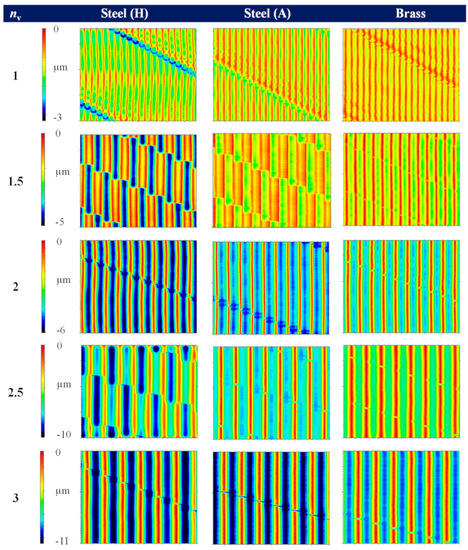 All surfaces created by SST are shown side by side in Figure 5 to ensure visual comparability. The color scaling of the rows with the same dwell value was standardized. In addition, as mentioned, the scaling is inverted as the highest point (the edges of the feedmarks) are at level zero, and the minimum represents the valleys of the groove. In that illustration, the different depth of the grooves resulting from the machining is clearly visible since the edge height is constant due to the kinematical roughness. This visualization style was continued consistently for all surface illustrations. It could be shown that the most significant differences in height occur in hardened steel, while the smallest are found in brass. Furthermore, the height scales increase with increasing dwell value, which can be explained by the higher kinematic roughness due to a larger groove width.