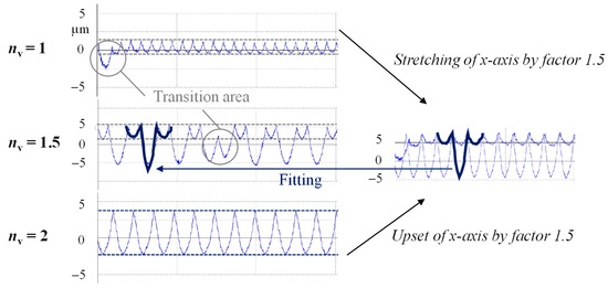 The illustrations in Figure 5 strongly support the hypothesis that the highest material squeezing occurs, in particular, during the SST process of hardened steel, resulting from the initial tool pushing-off and material spring-back effects. In connection with the effective negative rake angle resulting from the chamfer, the tools are deflected into the direction of the passive force during hard machining. Elastic material recovery can also be assumed. As a result, the target depth of the cut is not reached during the first pass. If an additional pass is made, the tool faces the remaining material with a significantly smaller thickness in relation to the cutting-edge radius. In this case, it is possible that the thickness is below the minimum undeformed chip thickness, which does not completely result in a material separation, but in the so-called “ploughing effect”—the material that comes into contact with the cutting edge is squeezed. Due to this “ploughing effect”, the final depth of cut is higher in comparison to the machining of brass, where such effects do not occur because of the significantly smaller tool cutting-edge radius. Due to the rising cross-section of the undeformed chip with increasing dwell value, this effect still occurs for a dwell value of 2.5. In addition, the ploughing effect is less dominant in the machining of the unhardened steel specimen, as the spring-back effect seems to be strongly reduced due to lower process forces. In combination with the largest cutting-edge radius, the plastic deformation of the second pass is the main mechanism. Thus, the depth difference between the two different areas of the groove is not as high as compared the hardened steel. While for a dwell value of 1.5, a variation of the structure depth in the circumferential direction is still visible every half turn, this effect can hardly be observed for a dwell value of 2.5 for soft steel. Furthermore, the alternating change of the groove depth at a dwell value of 1.5 in the cross-section is remarkable (Figure 6, = 1.5). For a more accurate analysis, the sections of = 1 and = 2 were modified, i.e., stretched or stretched along the x-axis, and then superimposed. The illustration in Figure 6 shows a high degree of agreement of the relevant range of this superimposition compared with the genuine cross-section of = 1.5 in the middle.