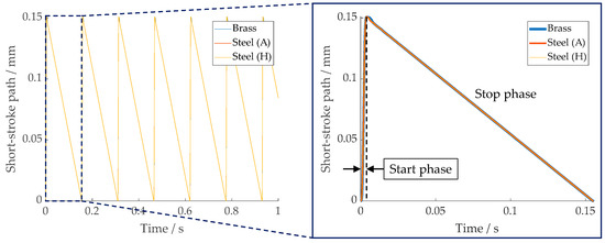 There is an increase in the groove depth that does not occur for the kinematical simulations. Additionally, there is no obvious change in the dynamic behavior of the drive system during machining. Its kinematics is characterized by an alternating movement with a fast acceleration during the start phase and a backward motion during the stop phase. The resulting short-stroke path can be measured by a position sensor, and it is depicted in Figure 7 for machining of brass, as-delivered unhardened (A), and hardened steel (H).