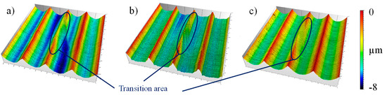 As long as remains smaller than , the tool flank face does not intersect with the kinematic surface structure in the transition phase. The transition angle of the tool trajectory is relatively high because is significantly larger than the sum of and . Thus, the intersection of the flank face can be excluded, which allows for a simplified two-dimensional tool representation in the simulative approach. Figure 4 shows a simulated kinematical surface structure and its transition area. The inverted height scale is considered to be more informative since the depth differences of the following real surface structures, compared to Figure 5, are more clearly perceived by this display method. It is noticeable that all minimum points of the valleys and the transition area are on the same depth level.