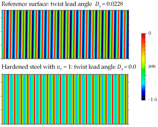The determination, according to MBN, generates a pseudo-topography from 72 cross-section profiles with an angular distance of 0.5°, which serves as a base for the calculation of the twist surface. Figure 9 compares these calculated surfaces for the reference specimen with twist (above, R) and the hardened steel specimen without twist for a dwell value of 1 (below, H1).