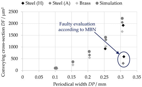 Figure 10 shows that there is a quadratic relationship between the conveying cross-section and the periodical width. However, the significant differences in the surface structure generated in steel with a non-integer dwell value result in a faulty calculation of the cross-section by the MBN. Furthermore, the deviations between the simulated and measured surfaces increase with rising groove distance.