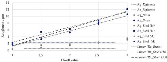 The diagram in Figure 11 shows the average roughness values of all tests, whereby the and values for the reference specimen are shown as a dashed line across the entire diagram width for better visual comparability. It is clear that with a dwell value of 1, the surface roughness of the twist-free and twist-affected surfaces are almost identical. With an increase in the dwell value, the roughness values increase approximately linearly, which is illustrated by the fitted trend lines.