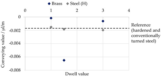 It can be assumed that for twist-free structures and a sealing lip width less than or equal to the periodical width, there is no increase in the oil volume in the radial shaft seal contact. Hence, no significant increase in the conveying value is visible in Figure 12 with increasing periodical width. Despite the irregular structural depth in the circumferential direction of the steel specimens for a dwell value of 1.5 (Figure 5), no change in the conveying value can be observed. A possible reason for that could be a deformation of the radial shaft seal. This leads to the conclusion that the explained effects from elastic–plastic deformation do not have any influence on the conveying value. Nevertheless, SST can represent a more productive process in comparison to conventional turning, especially at higher feeds. For brass, a significantly larger conveying value (in amount) was observed for a dwell value of 1.5, which might be a result of the increased wear of the twist structure.