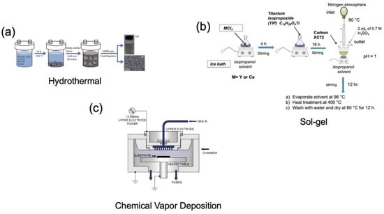 Different synthesis methods, such as physical and chemical methods [], can be applied to prepare 0D, 1D, 2D, and 3D nanomaterials using top-down and bottom-up approaches. Hydrothermal, solvothermal [,,], sol-gel [,], and chemical vapor deposition (CVD) methods [,] are commonly used to synthesize 0D nanomaterials. The latter have some advantages and limitations, including the possibility of integrating them into multiple systems and agglomerates []. Figure 2 shows a common procedure to synthesize 0D nanoparticles by hydrothermal, sol-gel, and vapor chemical deposition routes [].