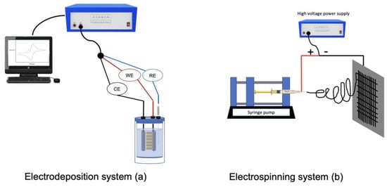 For 1D nanomaterials, electrochemical deposition [], electrospinning [,], and chemical vapor deposition [] are used to synthetize nanotubes, nanorods, and nanowires objects. The advantages involve the possibility to integrate them in low-cost devices, and their limitations are low production and high cost. Figure 3 illustrates the electrodeposition and electrospinning methods.