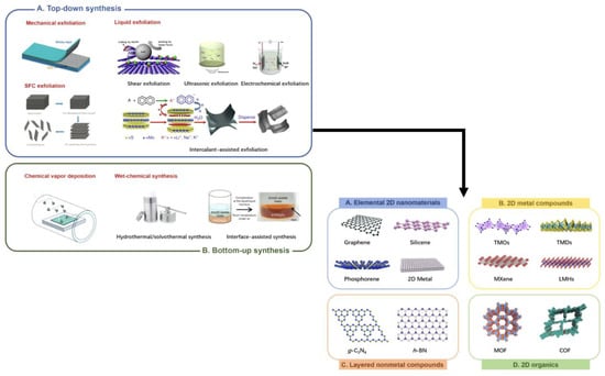 Some strategies for the synthesis of 2D nanomaterials. Figure modified and adapted with permission from Ref. []. Copyright (2021) Elsevier.