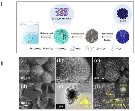 (I) Synthesis of 3D nanomaterials using non-precious metals, and (II) HRTEM analysis (a–f) for CoNiS samples. Figure modified and adapted with permission from Ref. []. Copyright (2022) Elsevier.