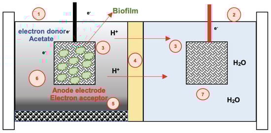 The most common configuration of MFCs is depicted in Figure 6. Microorganisms and electrodes are of utmost importance, and therefore, research has focused on both the diversity of microorganisms that can act as biocatalysts in the reactions carried out in the MFCs and the electrodes that are used to support the microorganisms conglomerate or biofilm. As a result of extensive research, it has been possible to classify the microorganisms that have been used over the years in MFC as low electrogenic (power production < 10 mW m−2), moderate (<100 mW m−2), high (<1000 mW m−2), and remarkably high (>1000 mW m−2), depending on the power density obtained in these systems []. Despite this classification, the effectiveness of the microorganisms in supplying energy also depends on other factors, such as the characteristics of the biofilm (e.g., texture, hydrophobicity, roughness), its ability to sustain the reactions occurring in the MFC chambers and electrodes (anodic or cathodic biofilms), and the type of material where the biofilm adheres. A cell may exhibit flagella, fimbriae, nanowires or pili, and excretion of extra polymeric substances (EPS) that serve during adhesion of the cell to the surface. A description of the forces involved during the initial stages of biofilm formation is detailed in references [] and []. The main forces involve non-covalent Van der Waals or electrodynamic, Lewis’s acid-base, and electrostatic (i.e., electrical double layer) interactions.