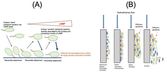 The physical aspects related to the cells are the motility—which is given by the flagella assisting the cell movements through concentration gradients or chemotaxis—through electric fields or electro or Galvanotaxis, magnetic fields or magnetotaxis, and light or phototaxis []. As pointed out in a recent report, in which Pseudomonas aeruginosa was studied on the formation of biofilms, a description of biofilm formation should include the information on how the cell senses a surface and the important steps to construct a community on it []. In Pseudomonas aeruginosa, two surface sensing mechanisms have been identified; one of them is like a chemotaxis signal transduction network, with the involvement of methyl-accepting chemotaxis protein (MCP) and several other proteins, including methylase and methyl esterease. This mechanism assumes that the surface exerts certain stress on the cell membrane, and this triggers the protein production and development of the mechanism that involves the MCP []. The second surface sensing mechanism suggests that the pili are involved (Pil-Chp system), along with several intracellular molecules, and that the biofilm formation does not necessarily occur linearly in a progressive sequence of steps, but in successive surface interactions and detachments, through which cells finally become adapted to the surface []. In this mechanism, the Type IV pili, which are produced through the Pil-Chp system, are involved. When the pili encounters a surface, the MCP protein transduces signals to other molecules, leading to an increase of the cyclic AMP (cAMP). This latter is a second messenger signaling molecule that controls a wide variety of extracellular actions in cells []. It has also been discovered that the whole Pil-Chp surface system response does not occur in a scale of time of hours, but longer. Figure 7A presents the formation of biofilm in experiments conducted with Pseudomonas aeruginosa, according to Lee et al. []. It has been suggested that in mixed cultures, the first cells that attach to the surface create the binding sites for a second species to attach, and therefore, the formation of the biofilm is promoted []. From a more practical point of view, considering that the surface sensing mechanisms have occurred, the biofilm formation has been depicted according to Figure 7B, in which the various stages of formation are illustrated. These stages are described as follows: (a) the attachment, reversible or irreversible; (b) the biofilm maturation; (c) the matrix formation with diffusion gradients; and (d) the erosion and different diffusion gradients.