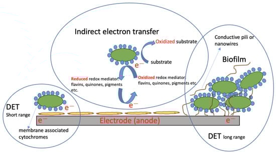 In bioelectrochemical systems including MFCs, the role of the biocatalyst (biofilm) and its constituent microorganisms is crucial for the electrode performance, either bioanodes or biocathodes. Thus, it is important to understand the electron transfer mechanisms. This manuscript focuses on biofilms formed on anodes. The study of electroactive biofilms has been largely directed at the electron transfer mechanisms and the factors influencing them. The electron transfer mechanisms presented by electrogenic bacteria once they have formed a biofilm on the electrode surface can be direct (DET) or indirect (IDET), as described below.