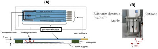 EIS experimental setups for three-electrode assembly in a flat patterned electrode (A) and Microbial Fuel Cell design (B). Figure (A) with permission from Ref. []. Copyright (2020) under Creative Commons Attribution License. Figure (B) with permission from Ref. []. Copyright (2021) IOP Publishing.