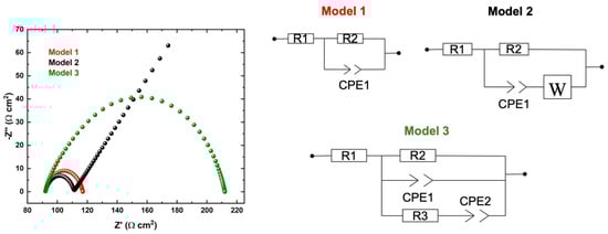 Simulation of Nyquist-EIS profiles with Model 1: R1 = 92 Ω, R2 = 25 Ω, Q = 20 μF, and a = 0.8; Model 2: R1 = 92 Ω, R2 = 19 Ω, Q = 20 μF, a = 0.8, and Aw = 5 Ω s−1/2; Model 3: R1 = 92 Ω, R2 = 120 Ω, R3 = 80 Ω, Q1 = 20 m μF, Q2 = 10 μF, and α1, α2 = 0.8. The geometric area was equal to 1 cm2 and frequency from 100 kHz to 1 mHz.