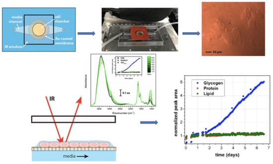 Surface and Spectroscopy techniques. Fourier Transformed infrared (FTIR) spectroscopy is used to measure the infrared absorption or emission spectrum of a solid, liquid, or gas. However, this technique has been implemented to monitor chemical changes in biofilms attached to a substrate. In this regard, Attenuated Total Reflection (ATR)-FTIR and FTIR spectroscopy have gained a lot of attention to monitor biofilm, non-destructively, in real time, and under fully hydrated conditions [,,,,]. Quilès et al. [] studied a bacteria named pseudomonas fluoresces to understand the initial steps of biofilm formation. In addition, Holman et al. [] developed a simple open-channel microfluidic system. They found that it is possible to directly monitor the activity of bacteria and their biochemistry at the molecular level within a biofilm for a long time. Therefore, different research groups are working to improve this method [,,]. Figure 11 depicts the microfluidic membrane device schematic and the obtained results.