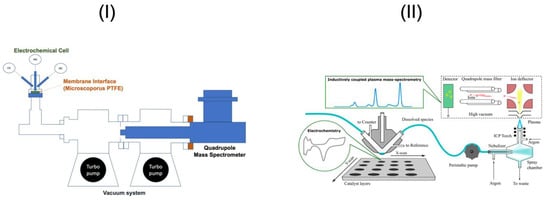 In in situ forms, the reaction is carried out and the by-products are quantified on the same timescale. Here, we can find Electrochemical On-line Inductively Coupled Plasma Mass Spectroscopy (ICP-MS) [] and Differential Electrochemical Mass Spectroscopy (DEMS) []. For the DEMS method, Kubannek et al. [] followed the CO2 production in electrochemically active bacteria during acetate oxidation. The typical components of an on-line DEMS instrument are shown in Figure 12I [].