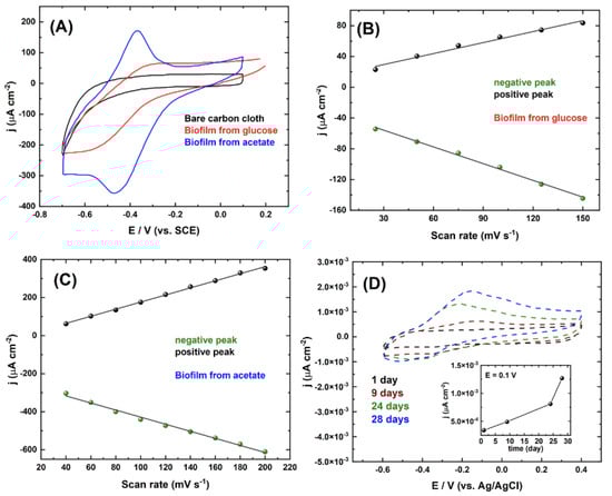 Nowadays, electrochemical methods are simple and fast tools for the analysis of electron transfer and pathway mechanisms. Therefore, this tool has been extended to understand the mechanism of electron transfer between microbial biofilms and an electronic conductor. The most common electrochemical methods are cyclic and linear voltammetry, where we can distinguish different redox peaks. Here, Yuan et al. [] electrochemically characterized carbon as an anodic biofilm with two different substrates: glucose and acetate. These findings are described in Figure 13A, where the current density as a function of scan rate, Figure 13B,C, on the same substrate is analyzed. According to this, the linear trend of the current density is governed by typical mass-diffusion phenomena.