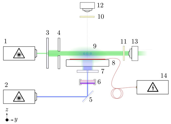 Principal scheme of the experimental setup with thin-film ITO trap: 1—535 nm laser source; 2—405 nm UV lase source; 3, 7—beam expander; 4—aperture; 5—mirror; 6—UV-attenuation filter system; 8—ITO surface trap; 9—localized charged particles; 10, 11—UV-filters; 12, 13—cameras; 14—trap’s power supply.