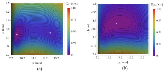 The map of effective potential distribution over the surface trap in the YZ-plane for the studied cases is shown in Figure 3. The colors of the given maps represent the effective potential normalized values, while the black lines are equipotential lines. Figure 3a corresponds to the case of the localization of CaCO3 spheres above the surface of the studied ITO trap in the absence of the light scattering force. We can see two independent potential minima marked with asterisks on the map corresponding to two independent localization zones. This means that charged CaCO3 particles can stably localize in two independent isolated areas above the surface of the studied ITO trap (DW regime). In the presence of light, with the wave vector directed opposite to the gravity force vector, the superposition of the forces along the Z-axis changes. Figure 3b presents the map of the effective potential in the case when the scattering force fully compensates the gravitational force. As seen, only one potential minimum corresponds to one stable localization zone. In this case, localization of the studied microspheres occurred only in one region (SW). We can conclude that compensation of the levitating charged particle gravity by the scattering force leads to transition from the DW regime to the SW regime.