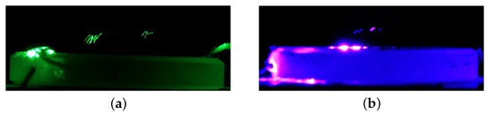 To verify the simulation results, we conducted an experiment with the setup shown in Figure 2. We investigated the spatial distribution of CaCO3 microspheres in the electric field of an ITO trap with and without UV light action. Photographs of the charged levitating CaCO3 particles over the surface of the studied trap were taken in the YZ-plane, and are shown in Figure 4. The particles’ oscillation amplitudes during the localization process was much higher than its actual size. Thus, Figure 4 represents the particles’ oscillation trajectories, rather than the actual particles.