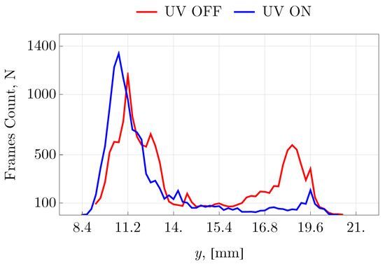 Figure 5 represents the total counts of bright pixels over the experiment. The red curve in Figure 5 corresponds to the CaCO3 microspheres’ detection frequency on the Y coordinate in the DW regime. The blue curve corresponds to the CaCO3 microspheres’ detection frequency on the Y coordinate in the SW regime after the gravity-compensating UV-laser was switched on. The results of bright pixel detection processing agreed well with the proposed model of the effective potential.