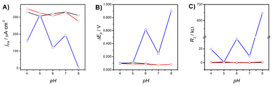 Evolution of jPA (A,D), ∆EP (B,E), and R2 (C,F) for bare Au (black solid line and empty circles), Au/AUT/P100 (blue), and Au/P100 (red) as a function of the electrolyte pH: FE8-FE4 (A–C) and RU8-RU4 (D–F). The data were extracted from the CVs and impedance spectra shown in Table S1.