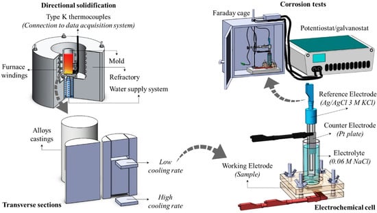 The alloys under investigation—namely. Zn−1Mg and Zn−1Mg−0.5Mn [wt.%]—were prepared using commercial purity metals, with their respective chemical compositions listed in Table 1. The experimental procedure involved placing weighed pieces of Zn into a SiC crucible, which was then placed inside a muffle furnace set at 600 °C. Once the Zn was completely melted, the other alloying elements (Mg and Mn) were added to the molten bath and mechanically homogenized. Subsequently, the liquid material was poured into an AISI 301 stainless-steel cylindrical mold, with an internal diameter of 55 mm and a height of 150 mm. This mold had been previously positioned within the casting chamber of a directional solidification apparatus, which was equipped with a water-cooled system at its bottom. Figure 1 illustrates an overview of the experimental methodology.