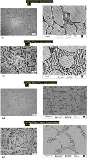 To provide more details of the as-solidified microstructures, Figure 2 displays characteristic optical and SEM images of the cross-sections of the DS castings for the Zn−1Mg and Zn−1Mg−0.5Mn [wt.%] alloys at positions 5 and 70 mm from the metal/mold interface.