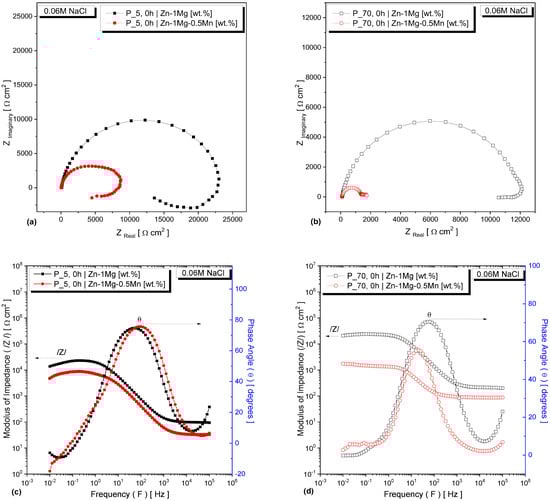 EIS results for the Zn−1Mg(−0.5Mn) alloys: Nyquist plots for samples from (a) P_5 and (b) P_70; Bode and Bode-phase diagrams for samples from (c) P_5 and (d) P_70.