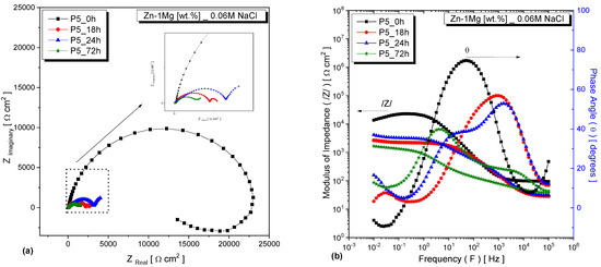 EIS plots for the Zn−1Mg alloy, sample from P_5, under different immersion times: (a) Nyquist plots and (b) Bode and Bode-phase diagrams.