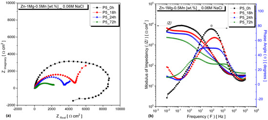 Figure 4 and Figure 5 depict the EIS results of the alloys, specifically focusing on sample P_5, after being immersed in a 0.06 M NaCl solution for various time intervals. The Bode diagrams reveal that the impedance modulus initially exhibited higher values at the beginning of immersion, indicating a greater resistance to corrosion. For samples immersed for 0 h, there was only one distinct peak in the phase angle. Moreover, in the low-frequency range, the observed phase angles were close to zero, indicating that the occurring phenomena had a purely resistive contribution. This can be affirmed, as phase angles equal to or close to 0° indicate the presence of resistors as circuit elements, while angles equal to or close to 90° refer to capacitive components [29,30,31]. However, as the immersion time increased to 18, 24, and 72 h, a second peak emerged—indicating the occurrence of additional electrochemical processes during the corrosion process. This observation can be observed in Figure 4a and Figure 5a. Moreover, the phenomenon of the changing phase angles was further reflected in the Bode and Bode-phase diagrams, as shown in Figure 4b and Figure 5b.