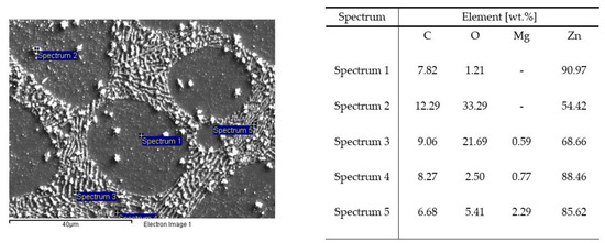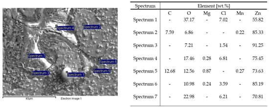 The SEM images in Figure 6 and Figure 7 illustrate the cross-sections of the Zn−1Mg and Zn−1Mg−0.5Mn alloy EIS test in a 0.06M NaCl solution. These images were obtained through energy-dispersive X-ray spectroscopy (EDS) analysis.