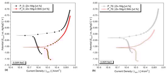Typical potentiodynamic polarization curves of the Zn−1Mg(−0.5Mn) alloys in a 0.06 M NaCl solution using samples from (a) P_5 and (b) P_70.