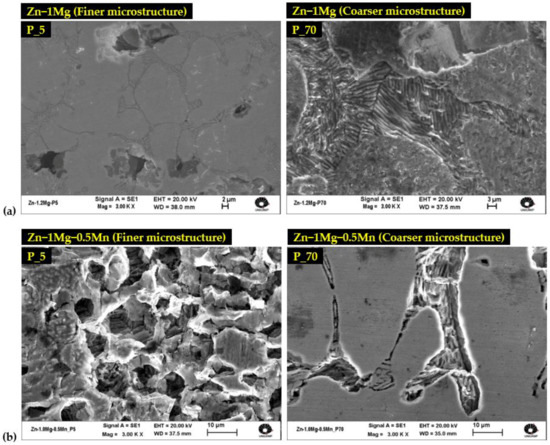 Micrographs of Zn−1wt%Mg alloy (a) P_5, (b) P_70; and Zn−1wt%Mg−0.5wt%Mn alloy (c) P_5, (d) P_70.