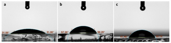 The images of live Contact angle with water measurements for the evaluated surfaces: (a) glass surface (control), (b) glass surface coated with PNIPAM, and (c) glass surface coated with PNIPAM-am.
